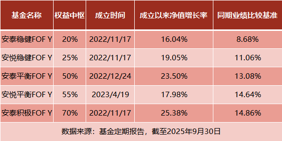 风险提示:兴证全球基金承诺以诚实信用、勤勉尽责的原则管理和运用基金财产,但不保证基金一定盈利,也不保证最低收益,投资人应当认真阅读本基金合同、招募说明书等基金法律文件,了解本基金的风险收益特征,并根据自身的投资目的、投资期限、投资经验、资产状况等判断本基金是否和投资人的风险承受能力相适应,自主判断基金的投资价值,自主做出投资决策,自行承担投资风险。我国基金运作时间较短,不能反映股市发展的所有阶段。基金管理人管理的其他基金的业绩或拟任基金经理曾管理的其他组合的业绩不构成基金业绩表现的保证。基金有风险,投资须谨慎。基金产品名称中含有“养老”字样并不代表收益保障或其他任何形式的收益承诺,养老基金不保本,可能发生亏损。投资个人养老金基金时,基金份额赎回等款项将转入个人养老金资金账户,投资人未达到领取基本养老金年龄或者政策规定的其他领取条件时不可领取个人养老金。截至2025年9月30日,兴全安泰稳健养老一年持有FOF A成立以来回报为19.32%,同期业绩基准回报为9.88%,其成立以来每年度的业绩及比较基准:2021(4.95%/2.80%)、2022(-2.09%/-4.10%)、2023(0.66%/-1.39%)、2024(5.85%/5.20%);本基金于2022年11月17日公告增设Y类基金份额,并于2022年11月23日开始办理申购等相关业务,截至2025年9月30日,成立以来回报为16.04%,同期业绩基准回报为8.68%,其成立以来每年度的业绩及比较基准:2022/11/23-2022/12/31(0.30%/0.01%)、2023(0.97%/-1.39%)、2024(6.12%/5.20%),本基金业绩比较基准:中证偏股型基金指数收益率×20%+中债综合(全价)指数收益率×80%。本基金每份基金份额的最短持有期限为1年。因此,对于基金份额持有人而言,存在投资本基金后,1年内无法赎回的风险。截至2025年9月30日,兴证全球安悦平衡养老目标三年持有FOF成立以来回报为19.21%,同期业绩基准回报为15.13%,其成立以来每年度的业绩及比较基准:2022/12/20-2022/12/31(0.48%/0.35%)、2023(-4.88%/-7.12%)、2024(5.31%/5.90%);本基金于2023年4月19日公告增设Y类基金份额,并于2023年5月4日开始办理申购等相关业务,截至2025年9月30日,成立以来回报为17.98%,同期业绩基准回报为14.64%,其成立以来每年度的业绩及比较基准:2023/5/4-2023/12/31(-5.94%/-7.20%)、2024(5.65%/5.90%),本基金业绩比较基准:中证偏股型基金指数收益率×50%+恒生指数收益率 (使用估值汇率折算)×5%+中债综合(全价)指数收益率×45%。兴全安泰平衡养老三年持有FOF A截至2025年9月30日,成立以来回报84.25%,同期业绩基准回报为53.06%,其成立以来每年度的业绩及比较基准:2019/1/25-2019/12/31(21.08%/18.46%)、2020(26.89%/23.92%)、2021(6.36%/3.57%)、2022(-8.06%/-10.89%)、2023(-2.08%/-6.46%)、2024(6.61%/5.14%);本基金于2022年12月24日公告增设Y类基金份额,并于2022年12月30日开始办理申购等相关业务,成立以来回报为23.50%,同期业绩基准回报为13.08%,其成立以来每年度的业绩及比较基准;2022/12/30 - 2022/12/31(0.00%/0.08%)、2023(-1.82%/-6.46%)、2024(6.88%/5.14%),本基金业绩比较基准:中证偏股型基金指数收益率×50%+中债综合(全价)指数收益率×50%。本基金每份基金份额的最短持有期限为3年。因此,对于基金份额持有人而言,存在投资本基金后,3年内无法赎回的风险。兴全安泰积极养老目标五年持有FOF成立于2020年12月16日,兴全安泰积极养老目标五年持有FOF A,截至2025年9月30日,成立以来回报为19.70%,同期业绩基准回报为6.21%,其成立以来每年度的业绩及比较基准:2021(7.93%/3.88%)、2022(-11.06%/-15.32%)、2023(-5.76% /-9.77%)、2024(6.56%/4.84%);本基金于2022年11月17日公告增设Y类基金份额,并于2022年11月22日开始办理申购等相关业务,截至2025年9月30日,成立以来回报为25.38%,同期业绩基准回报为14.86%,其成立以来每年度的业绩及比较基准:2022/11/22-2022/12/31(0.64%/-0.48%)、2023(-5.38%/-9.77%)、2024(6.96%/4.84%),本基金业绩比较基准:中证偏股型基金指数收益率×70%+中债综合(全价)指数收益率×30%。本基金每份基金份额的最短持有期限为5年。因此,对于基金份额持有人而言,存在投资本基金后,5年内无法赎回的风险。兴证全球安悦稳健养老一年持有FOF A成立于2021年9月17日,截至2025年9月30日,成立以来回报17.22%,同期业绩基准回报为6.39%,其成立以来每年度的业绩及比较基准:2021/9/17-2021/12/31(1.24%/0.65%)、2022(-1.91%/-4.33%)、2023(0.98%/-2.06%)、2024(7.01%/6.01%);本基金于2022年11月17日公告增设Y类基金份额,并于2022年11月23日开始办理申购等相关业务,截至2025年9月30日,成立以来回报为19.05%,同期业绩基准回报为11.06%,其成立以来每年度的业绩及比较基准:2022/11/23-2022/12/31(0.09%/0.53%)、2023(1.29%/-2.06%)、2024(7.29%/6.01%),本基金业绩比较基准:中证偏股型基金指数收益率×20%+恒生指数收益率(使用估值汇率折算)×5%+中债综合(全价)指数收益率×75%。本基金每份基金份额的最短持有期限为1年。因此,对于基金份额持有人而言,存在投资本基金后,1年内无法赎回的风险。